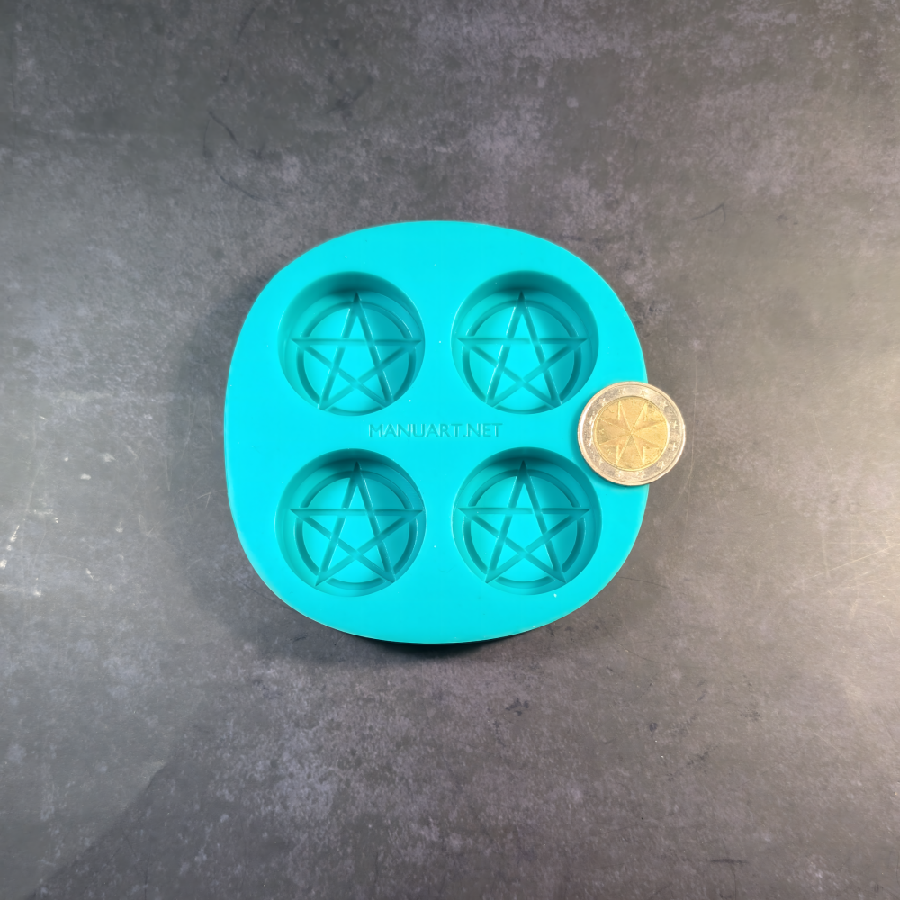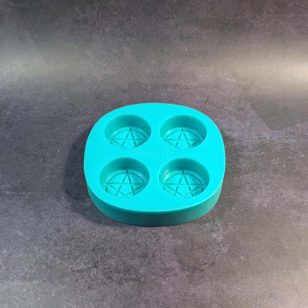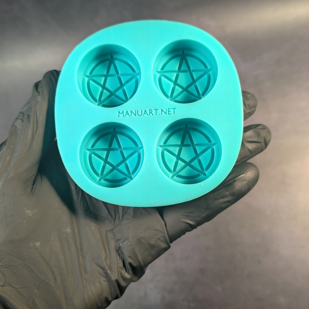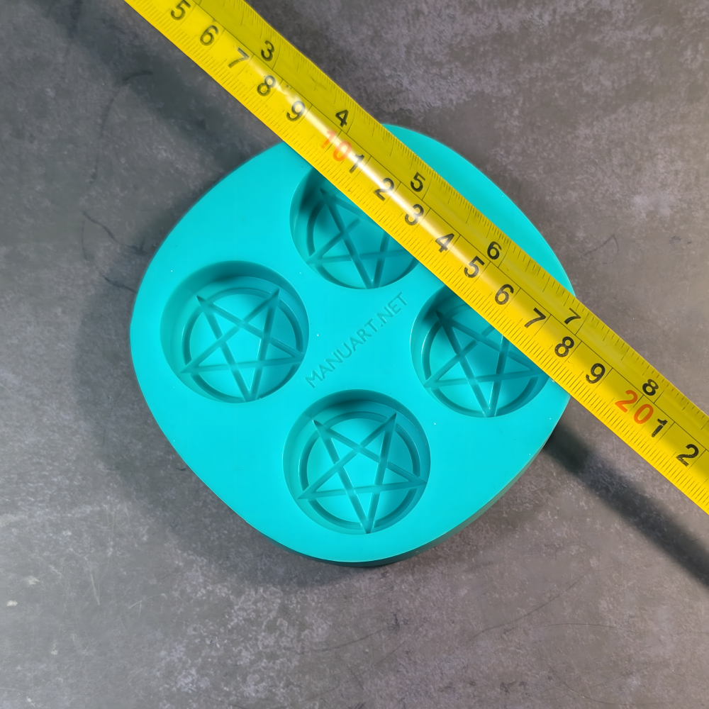 • This food safe silicone mold has 4 cavities with pentagram designs. The size is made to fit standard US and EU tealight formats and is also great for small ritual pieces, wax melts, soap, resin, plaster, chocolate, and cake decoration.